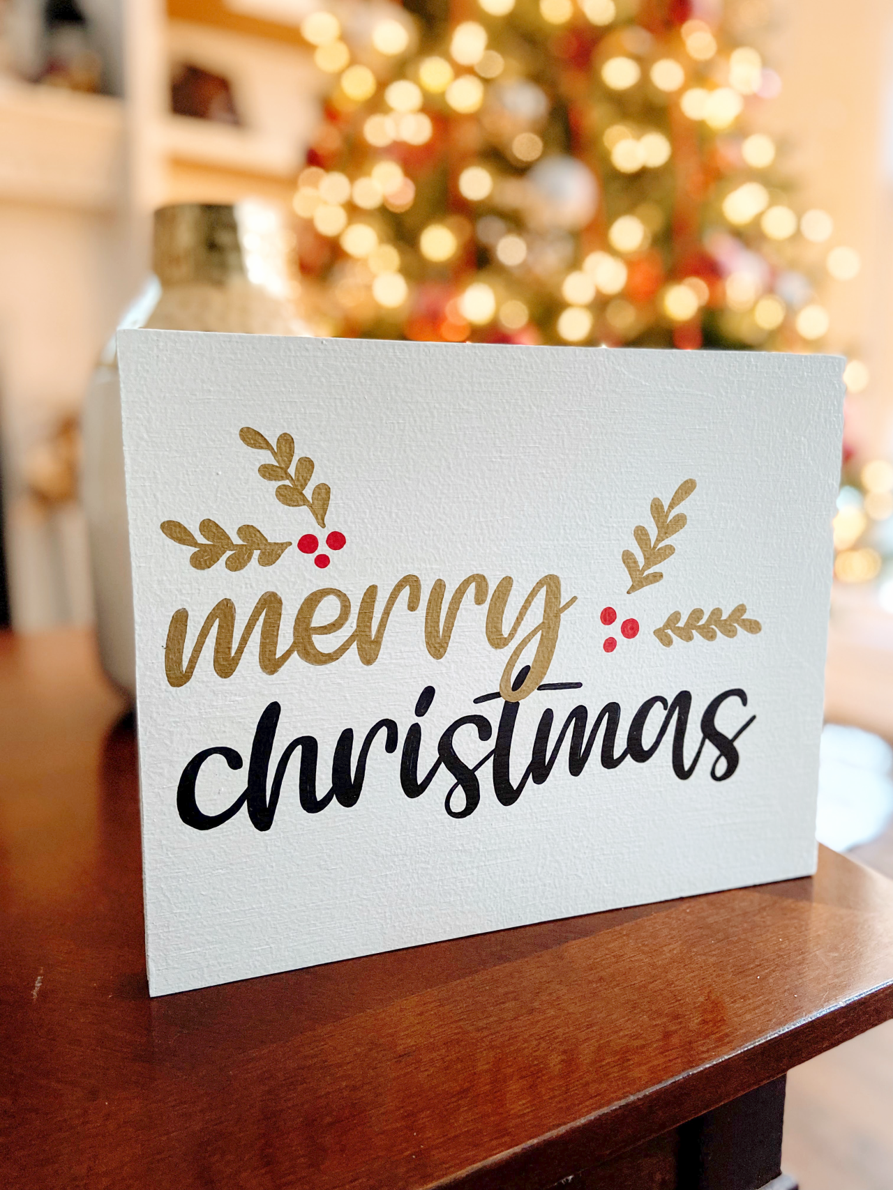 "Merry Christmas" is a signature hand painted wood sign by The Painted Oak Shop. This small white sign features gold and black hand painted cursive lettering and festive gold holly accents that will fit perfectly your holiday decor!